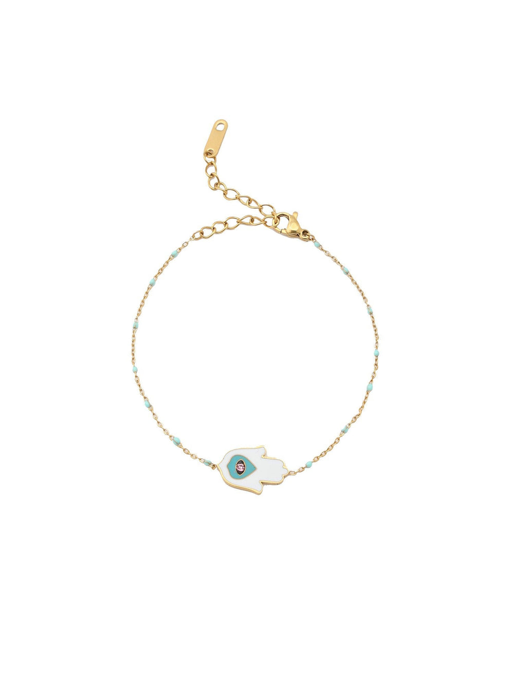 Wear the 'Adorn' Hamsa station bracelet, a blend of elegance and mysticism, adorned with a protective touch in gold-tone stainless steel, fastened securely with a lobster clasp."